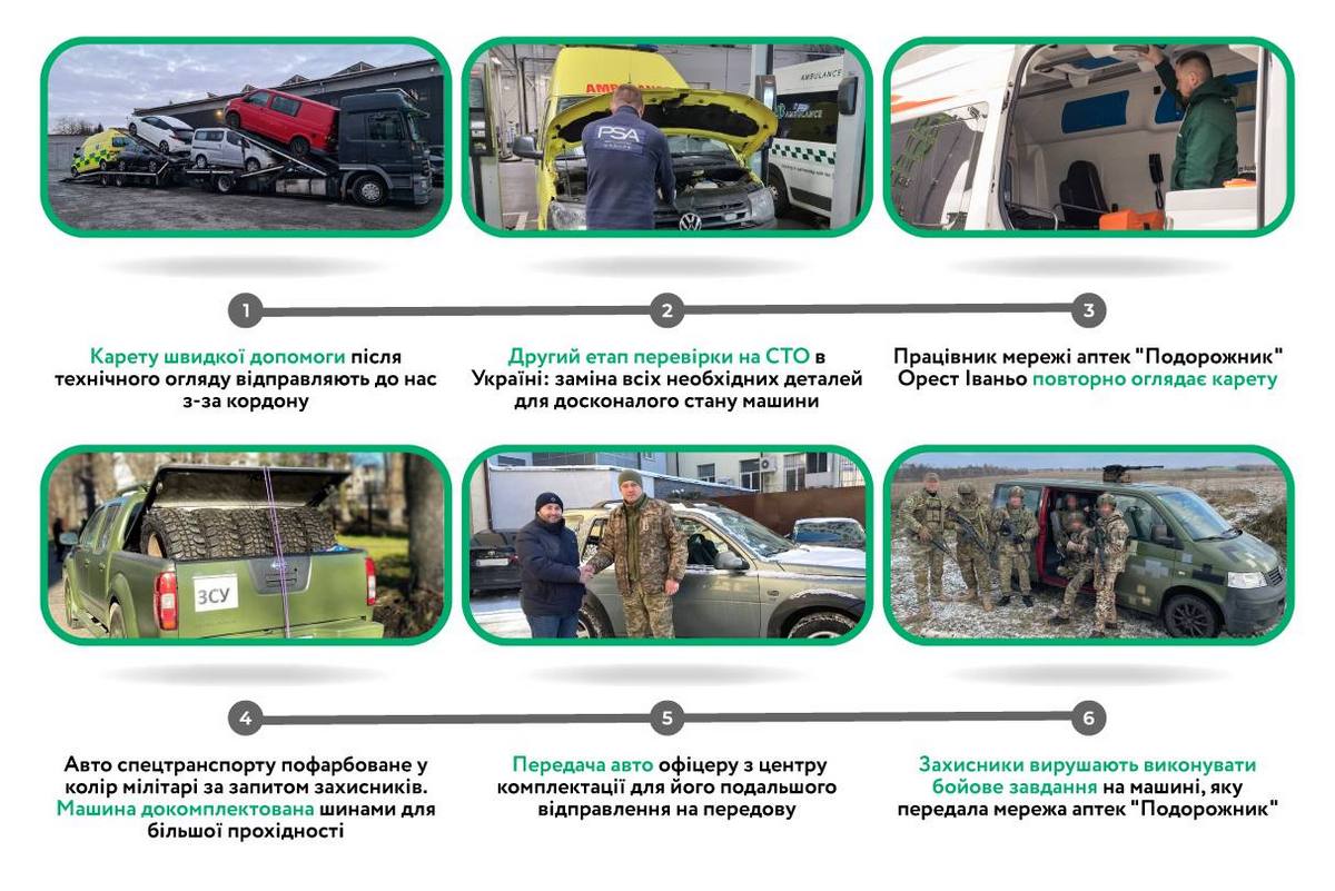 За ініціативи мережі аптек Подорожник кожне авто для ЗСУ, яке приїхало з-за кордону, перевіряють на автосервісі. Там міняють всі необхідні деталі й забезпечують досконалий стан, щоб машина не підвела на фронті.
