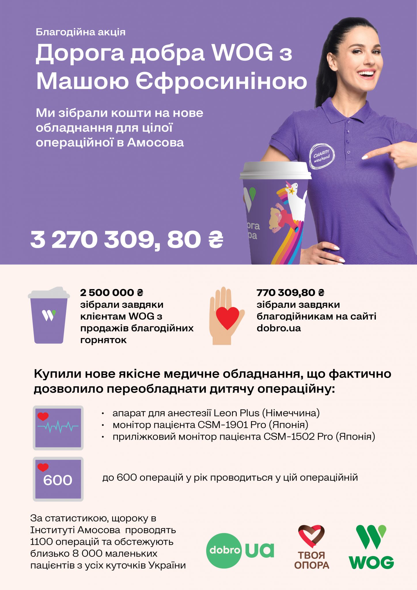 Компанія WOG разом з партнерами Dobro.ua, БФ «Твоя Опора» та Машою Єфросиніною здійснили масштабне переобладнання дитячої операційної у Інституті Амосова. Вони придбали апарат для анестезії, монітор стану пацієнта та приліжковий монітор пацієнта загальною вартістю 3 270 309,80 грн. Кошти зібрали у рамках акції «Дорога добра».