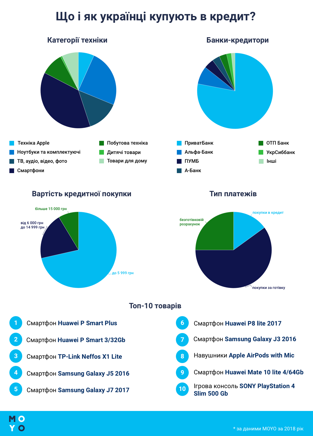 Примітно, що в кредит, по більшій частині, купується порівняно недорога техніка. Так, основна частка покупок припадає на товари з цінником до 6000 грн. Українці беруть в розстрочку на кілька місяців смартфони й аксесуари до них, що дозволяє робити покупки безболісно для сімейного бюджету.