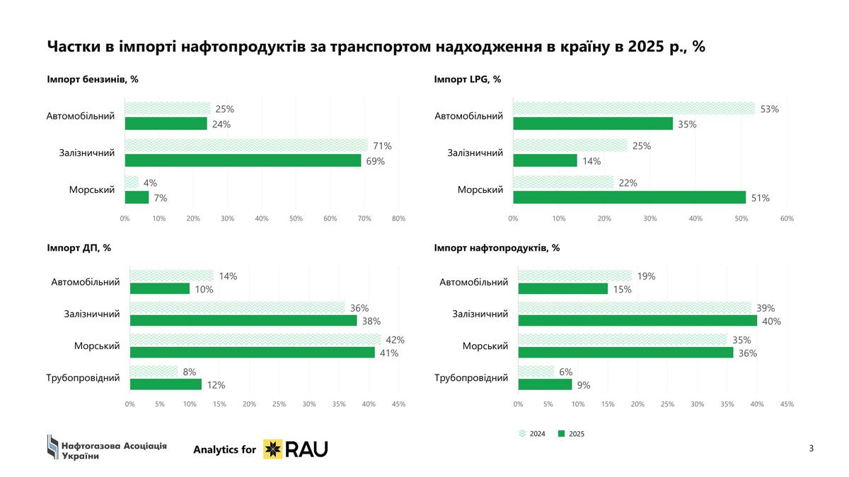 Так само змін зазнали транспортні ланцюжки. Якщо в 2021 році більше 80% ПММ завозились залізницею, то зараз це лише 40%. Якщо порівняти частки в імпорті нафтопродуктів за транспортом надходження в країну в 2025 році, помітно, що найбільш суттєвих змін зазнала структура постачання LPG, де акцент із постачання автотранспортом змістився до морських перевезень. Так, частка імпорту скрапленого газу морем збільшилася до 51%, а транспортування автомобільним транспортом скоротилося з 53% до 35%.