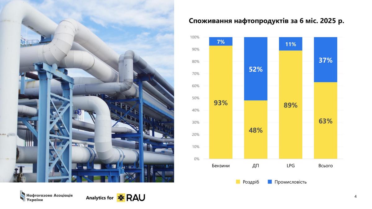 Якщо проаналізувати споживання нафтопродуктів за перші шість місяців поточного року, помітно, що більшість нафтопродуктів (63%) реалізується через мережі АЗС, а на промислове споживання припадає всього 37% загального балансу. Природньо більшість бензинів та скрапленого газу – це реалізація на АЗС, а ДП – промисловість (52%).
