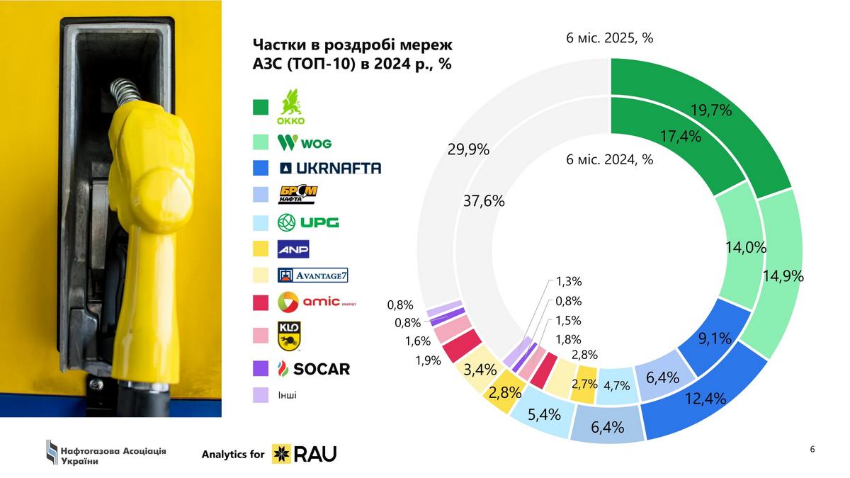 Ринок паливного ритейлу дуже конкурентний. Кожна з мереж має свою стратегію, свою ефективність, своїх прихильників. Як видно на діаграмі, серед топ-10 мереж за часткою роздрібного ринку в 2025 році більше половини гравців наростили свою частку. Наприклад, приріст частки продажів нафтопродуктів у січні-червні 2025 року відносно першого півріччя 2024-го продемонстрували АЗК компанії ОККО (+2,3%), які тепер займають за цим показником п’яту частину ринку. Також наростили свою частку мережі заправок WOG (+0,9%) та Ukrnafta (+3,3%). Державна Ukrnafta (входить до групи Нафтогаз) має найбільшу динаміку приросту, що зумовлено, зокрема, придбанням 118 АЗК мережі Shell в Україні наприкінці 2024 року (угода повністю закрита у серпні 2025-го).