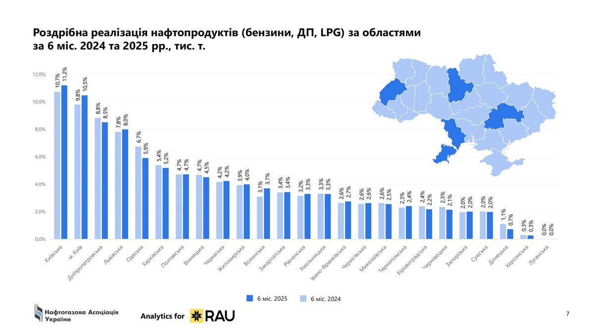 В географічному розподілі продажів за областями роздрібна реалізація нафтопродуктів (бензини, ДП, LPG) за перші півроку 2025-го майже не змінилися відносно аналогічного періоду минулого року. Лідером із споживання залишається Київська область з часткою 11,2%, на другому місці – місто Київ (10,5%). Окрім столичного регіону невеликий приріст продажів стався у Львівській, Тернопільській, Івано-Франківській, Рівненській, Волинській та Житомирській областях.