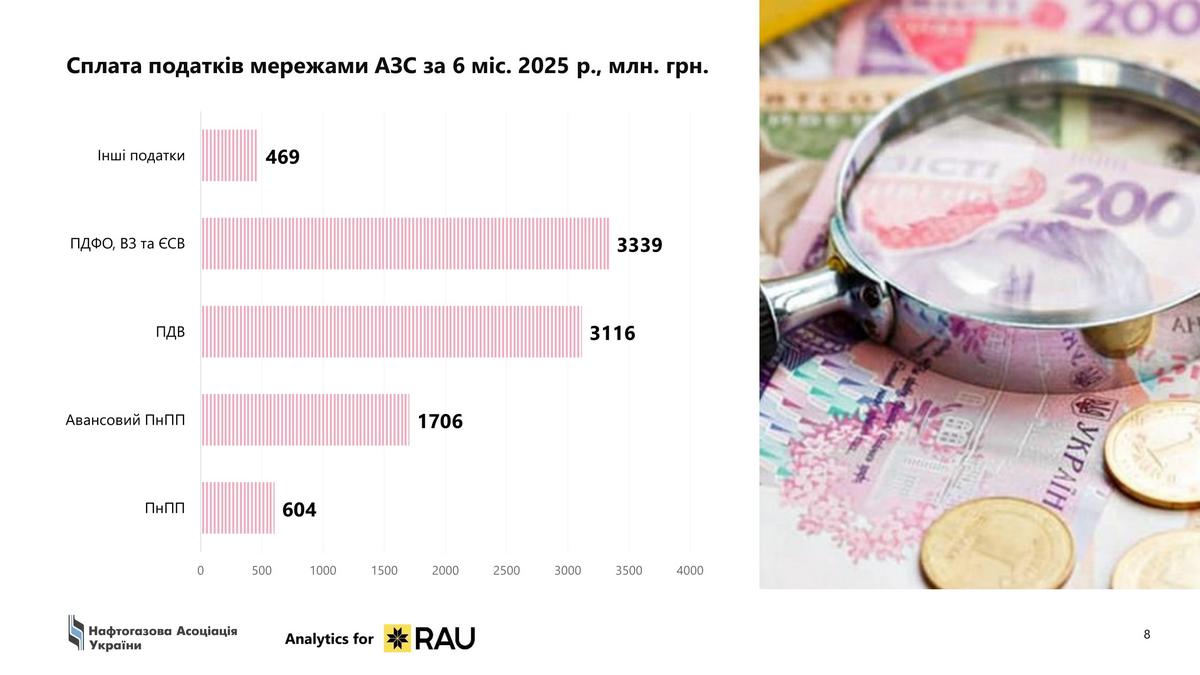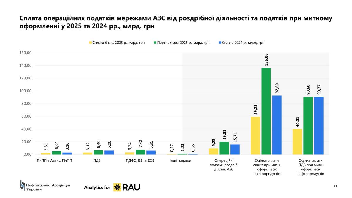 Сплата операційних податків мережами АЗС від роздрібної діяльності та податків при митному оформленні збільшилася у 2025 році. Збільшення надходжень до бюджету є результатом заходів, спрямованих на детінізацію ринку пального, підвищенням ставок акцизного та військового зборів.