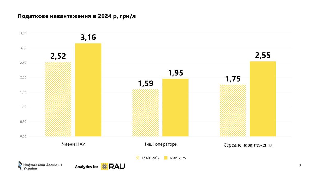 Зростання податкового навантаження на літрі пального в Україні у І півріччі 2025 року стало одним із найбільш визначальних чинників, що вплинули на роздрібний ринок. Це зростання було обумовлене двома основними напрямками: фіскальною реформою та активною детінізацією галузі, які посилили податкову відповідальність для всіх операторів. В результаті середнє податкове навантаження на літр пального збільшилося в півтора раза – з 1,75 грн/л до 2,55 грн/л (з авансовими платежами).