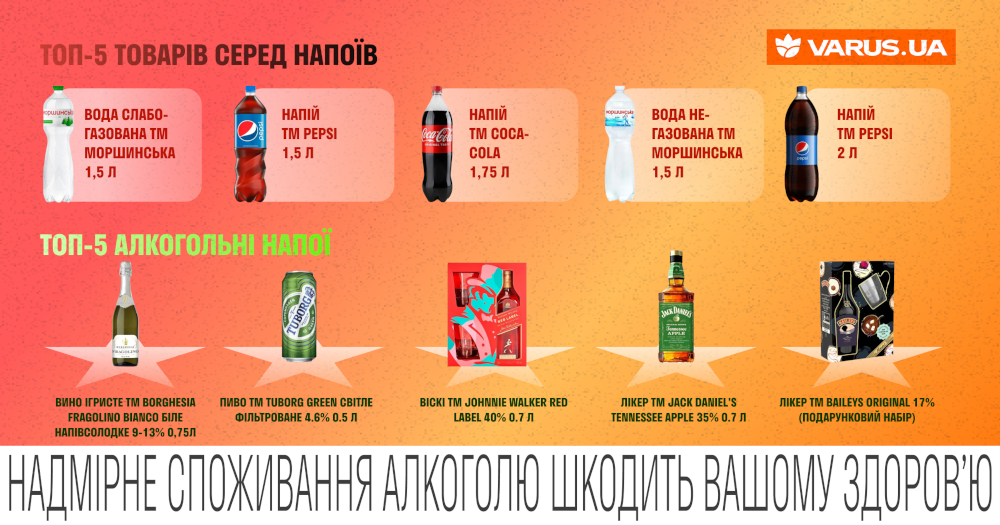 Оскільки зима — період свят, українці також часто додавали до свого кошика алкогольні напої. Смаки клієнтів виявились різноманітними — у топ-5 потрапили як слабоалкогольні, так і більш міцні напої. Так, до найбільш популярних алкогольних напоїв на varus.ua увійшли: лікер Jack Daniel’s Tennessee Apple 35%, вино ігристе Borghesia Fragolino Bianco біле напівсолодке 9-13%, лікер Baileys Original 17% (подарунковий набір), пиво Tuborg Green світле фільтроване 4.6%, віскі Johnnie Walker Red Label 40%.