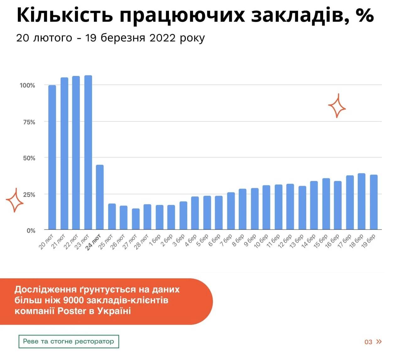 Результати дослідження проведеного компанією з автоматизації закладів Poster ґрунтуються на даних понад 9000 закладів-клієнтів компанії в Україні. «Наприкінці лютого у країні працювало лише 14% закладів у порівнянні з довоєнним показником 20 лютого. З початку березня тенденція змінюється: ресторатори потрохи повертаються до роботи навіть попри воєнний стан», — повідомили у компанії.