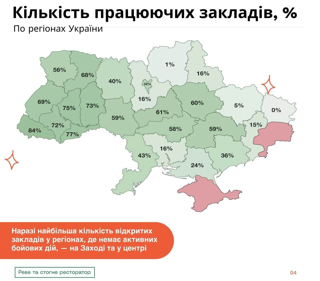 Наразі найбільша кількість відкритих закладів у регіонах, де немає активних бойових дій. Так, у Закарпатській області сьогодні працюють 84% закладів, у Чернівецькій — 77%, у Тернопільській — 73%, у Хмельницькій — 75%, в Івано-Франківській — 72%, у Львівській — 69% від довоєнної кількості.