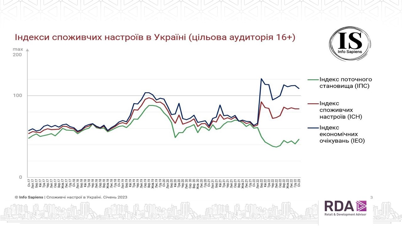 Враховуючи ситуацію, Індекс споживчих настроїв українців дивує: якщо у січні 2022 року він складав 62,3%, то вже у січня 2023-го – 83,8%. В січні минулого року було чимало розмов про війну і багато невідомого, відповідно, громадяни України переживали, що буде далі. Після звільнення Київщини і початку стабілізації фронту, споживчі настрої покращилися і зараз ситуація виглядає таким чином, що населення України досить оптимістичне.