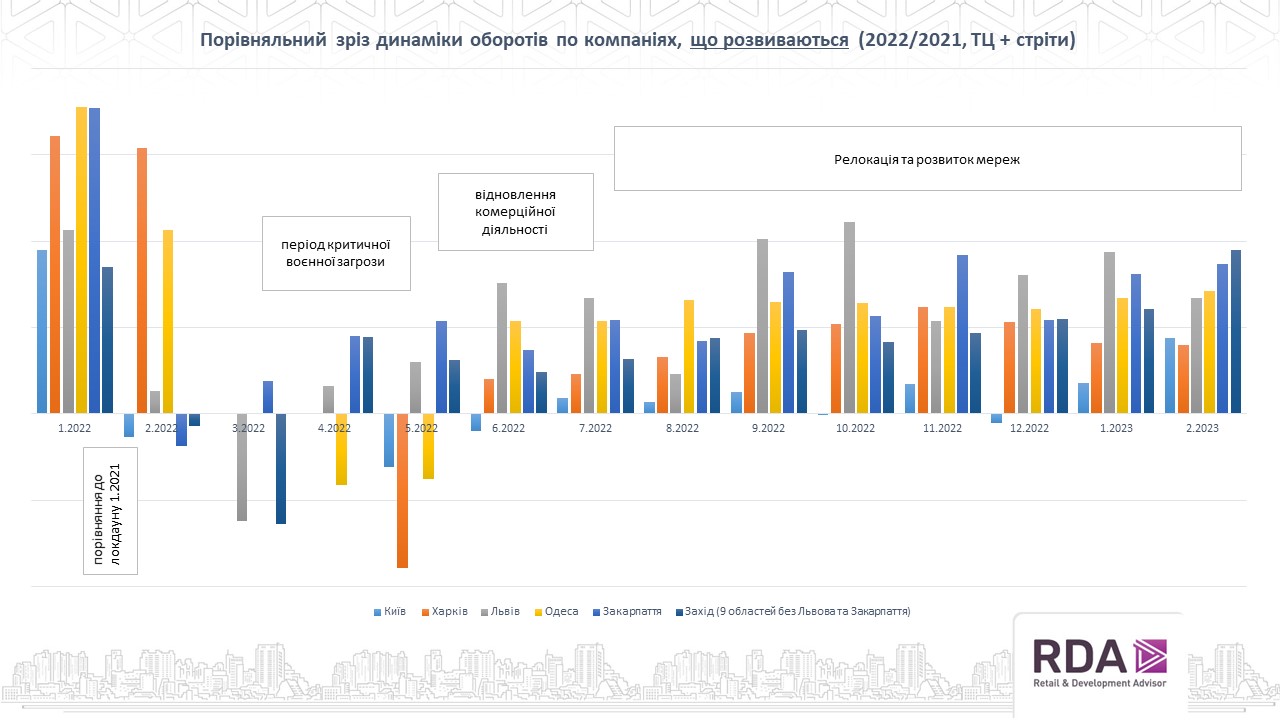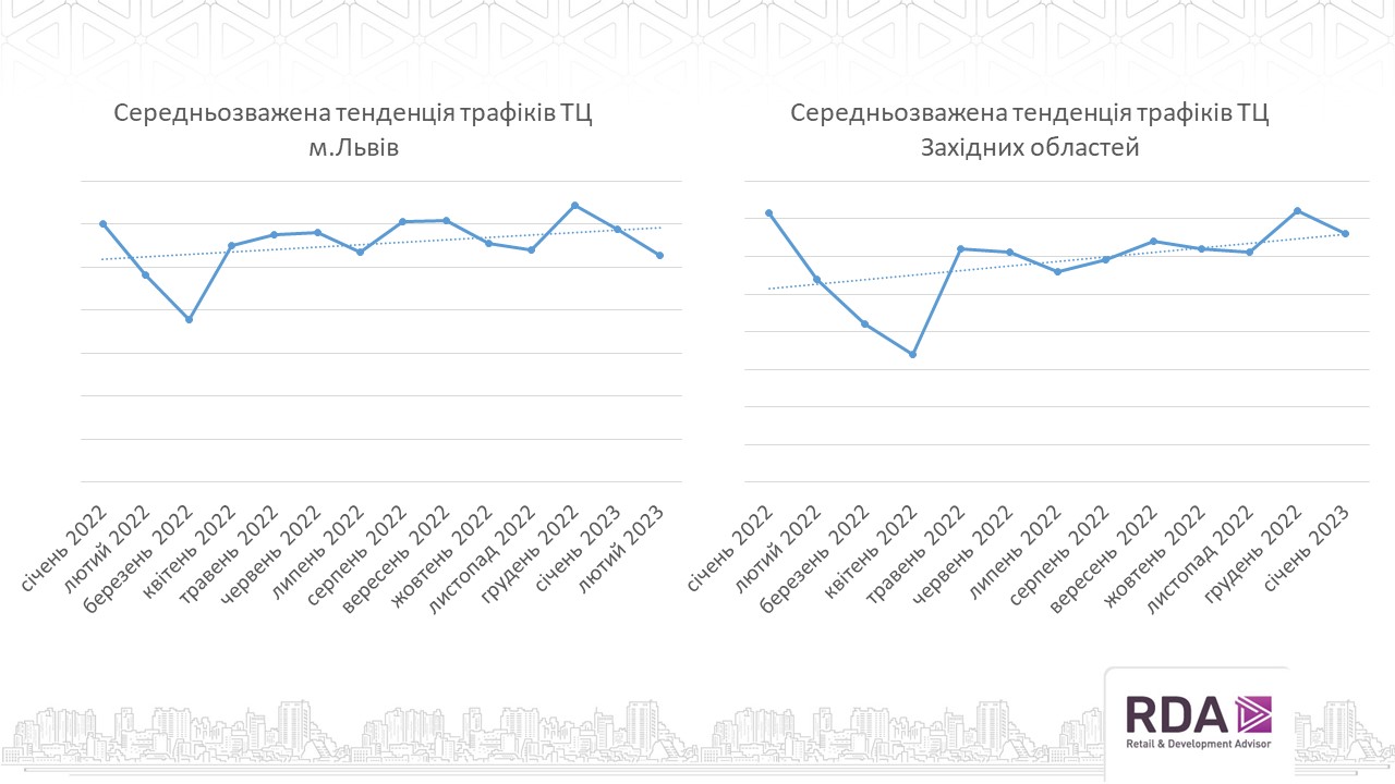 На заході ситуація значно краща. Багато рітейлерів релокували свої магазини, у тому числі, відкривали нові магазини як в торговельних центрів, так і street-retail. У липні відбулося падіння через зворотню міграцію населення із західних регіонів. Але далі трафіки ТЦ/ТРЦ вирівнюються і вже в грудні-січні 2023 року вони фактично повертаються до минулорічного тренду, тому західний регіон і, зокрема, Львів залишаються самими привабливими для рітейлу загалом.
