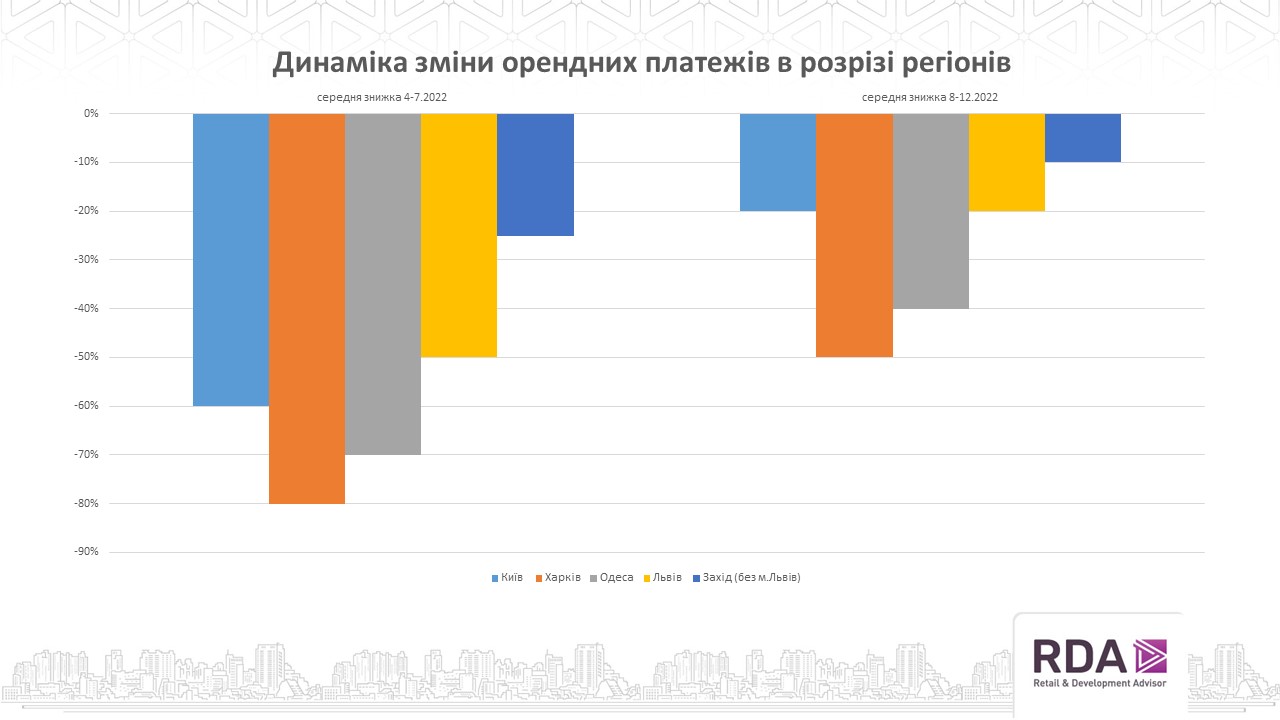 Вартість оренди в торговельних центрах також змінювалась по періодах. Для порівняння ми взяли два періоди – з 4-го по 8-й місяць 2022 року, і з 8-го по 12-й. Найбільше на орендні платежі впливав регіональний фактор: вагоме зниження орендних ставок було в містах, найближчих до лінії фронту, найменше – у західних регіонах.