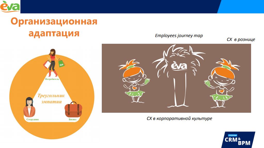 Мережа EVA складається з 685 торгових точок, які обслуговують понад 7000 співробітників. Персонал залучити до програми СЕМ дуже складно, тому як це величезний блок програми, про який потрібно думати, перш ніж приймати рішення: йти по шляху СЕМ чи не йти.