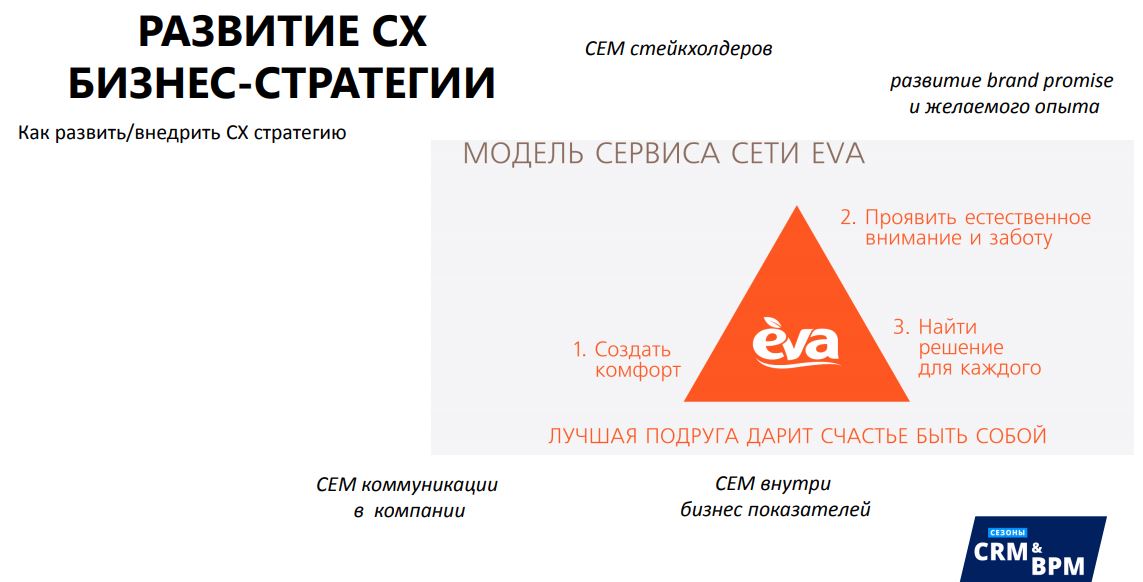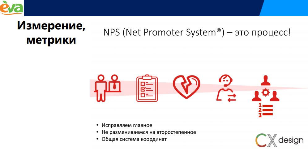 Як виміряти те, що ви робите в рамках Customer Experience Management? В EVA на це питання відповідає NetPromoterSystem – постійна система, за допомогою якої ми вимірюємо NPS нашого клієнта, NPS ринку, відбудовував взаємодія даного NPS на різних точках впливу і точках процесу. І це вже оцифровані показники, які прив’язуються потім до процесів для того, щоб їх покращувати. Потрібно розуміти, що це базова система в рамках побудови СЕМ.