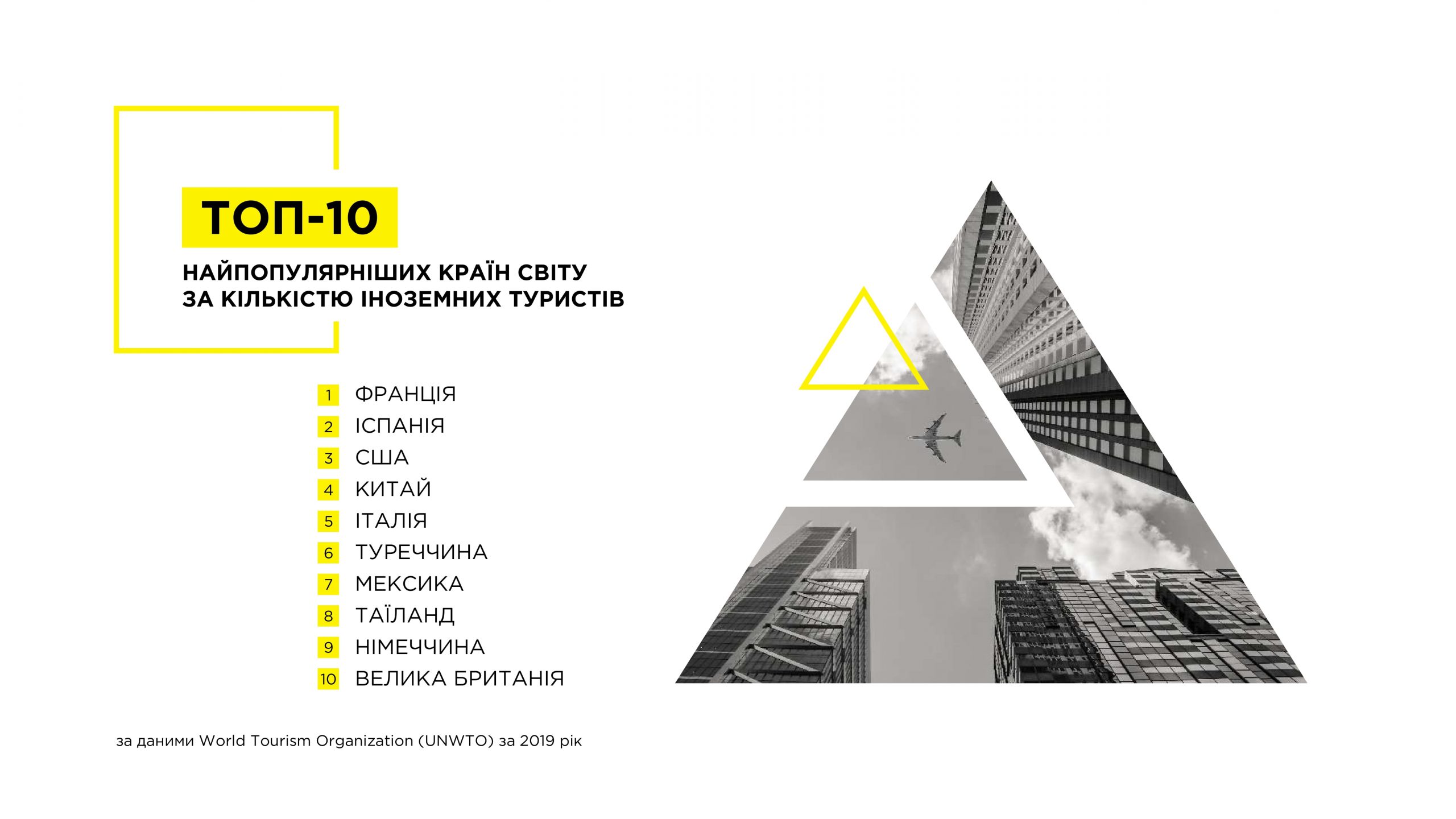 За даними World Tourism Organization (UNWTO) за 2019 рік, топ-10 найпопулярніших країн світу за кількістю іноземних туристів виглядає наступним чином:
