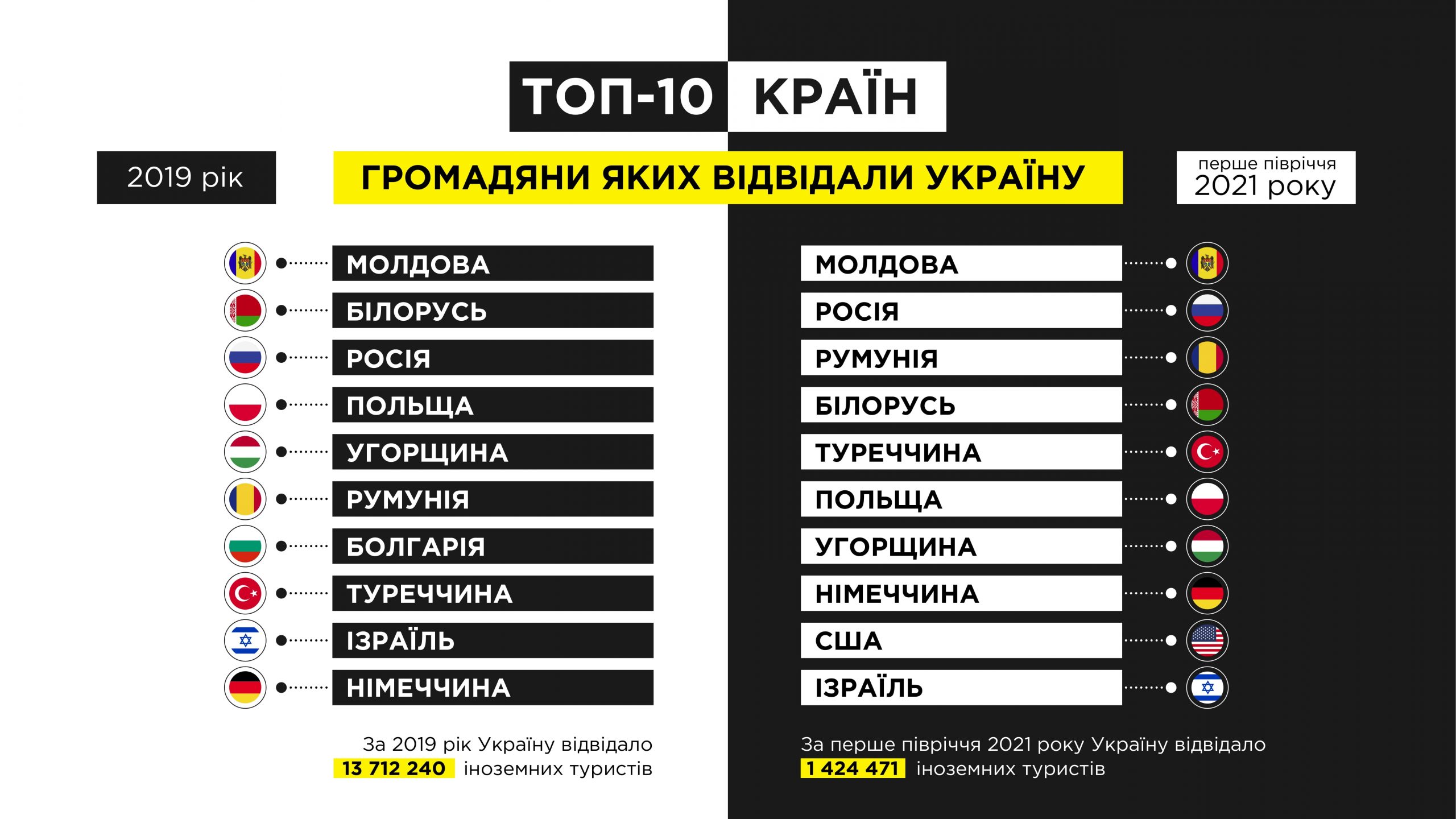 За підсумками 2019 року, Україну відвідали 13,7 млн туристів, у 2020 році – лише 1,5 млн туристів, а за перше півріччя 2021 року – вже 1,5 млн туристів.