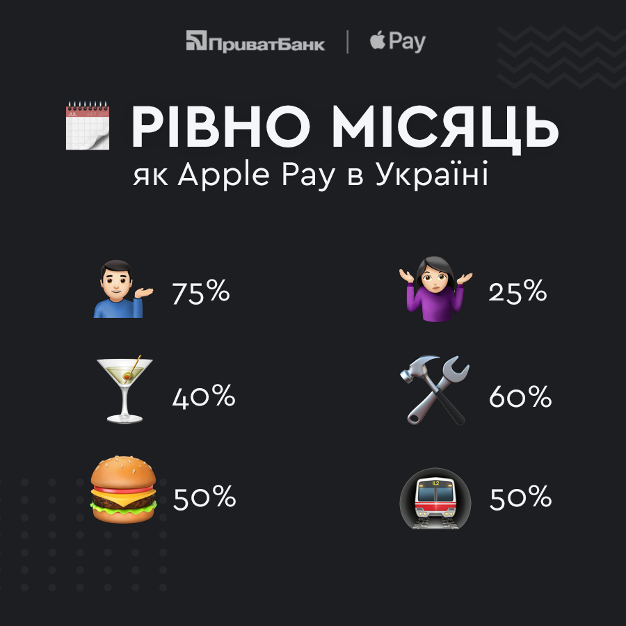 Через місяць після запуску сервісу ПриватБанк підготував інфографіку: хто та як використовує ApplePay в Україні. Що примітно і досить несподівано: найчастіше за допомогою сервісу розраховуються в будівельних магазинах. З іншого боку, це можна пояснити, так як, за даними ПриватБанку, 75% користувачів системи безконтактних платежів – чоловіки. Серед інших місць, де користувачі більш охоче за все оплачують покупки за допомогою інноваційної технології – фаст-фуд, проїзд в метрополітені (очевидно, тільки для Києва та Харкова) і бари. В інших сферах роздрібної торгівлі сервіс ApplePay використовують набагато рідше.