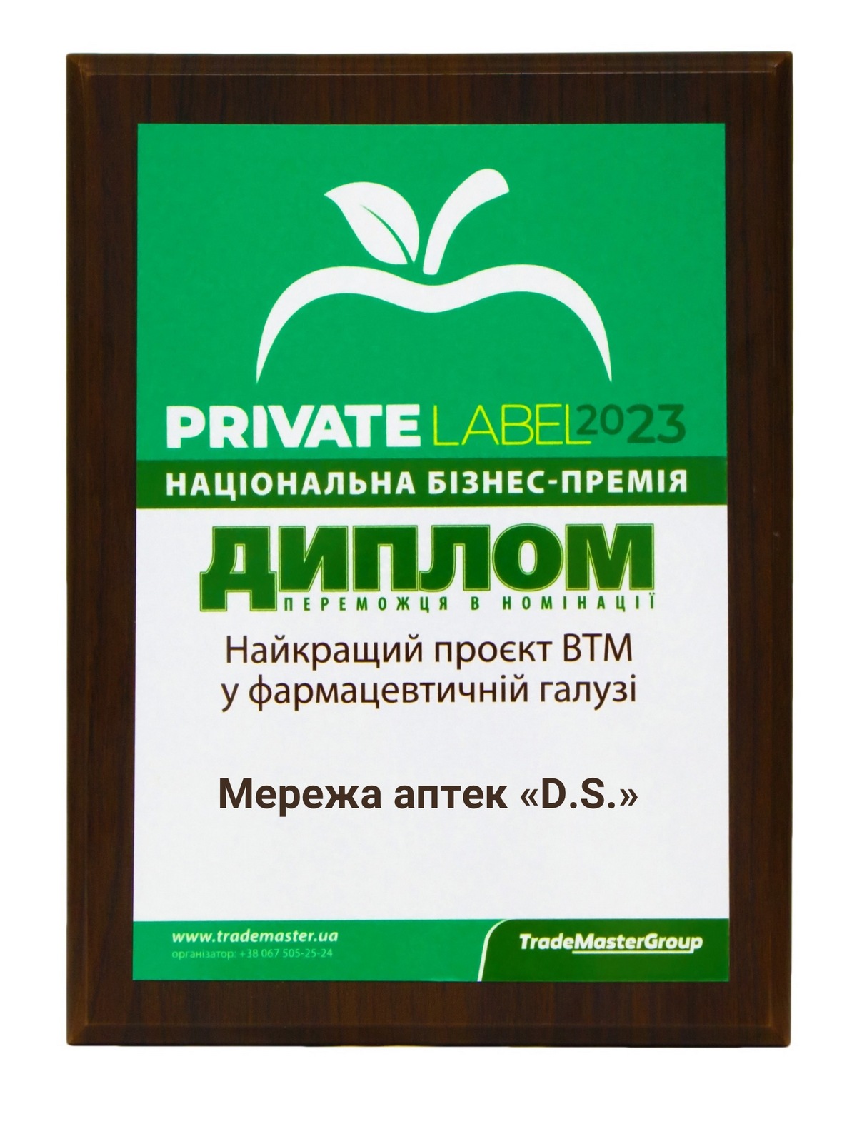 На ХV міжнародній щорічній конференції TradeMasterGroup «PrivateLabel-2023», яка акумулює кращий український та зарубіжний досвід у сфері товарів власної торгової марки, мережа аптек D.S. отримала нагороду у номінації «Найкращий проект у фармацевтичній галузі». Цьогоріч це єдина компанія з-поміж усіх вітчизняних аптечних мереж, чия діяльність здобула відзнаку.