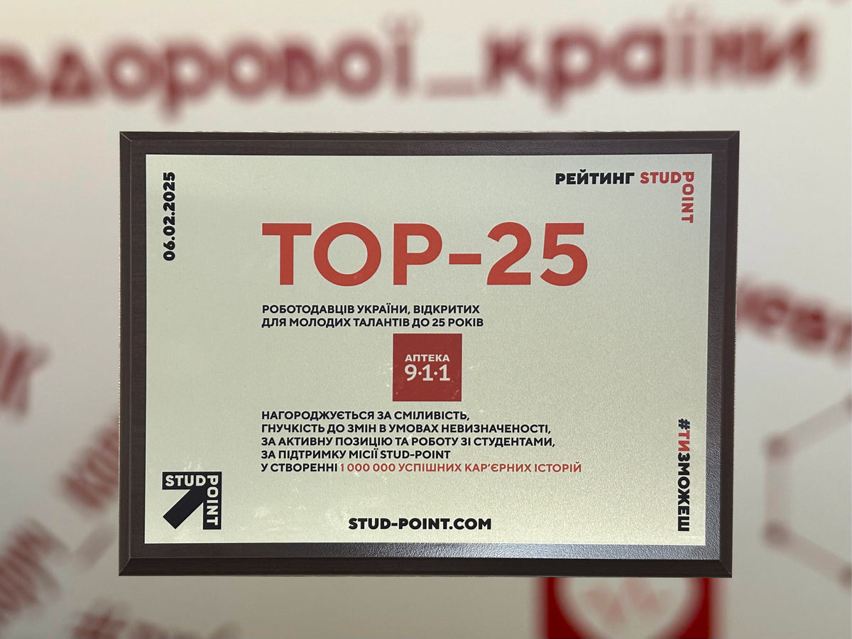 6 лютого 2025 року Аптека 9-1-1 отримала престижне визнання на щорічному форумі HR-Point 2025, увійшовши до рейтингу 25-ти найкращих роботодавців України, які активно підтримують молодих фахівців віком до 25 років. Рейтинг, який щороку формується платформою Stud Point, відзначає компанії, що демонструють найкращі практики у роботі з молоддю, включаючи освітні програми, стажування та працевлаштування.