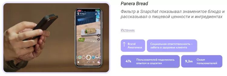 Panera Bread для просування свого фірмового блюда використовує доповнену реальність в соціальних мережах Snapchat, де бренд показує харчову цінність продукту і підвищує обізнаність про бренд.