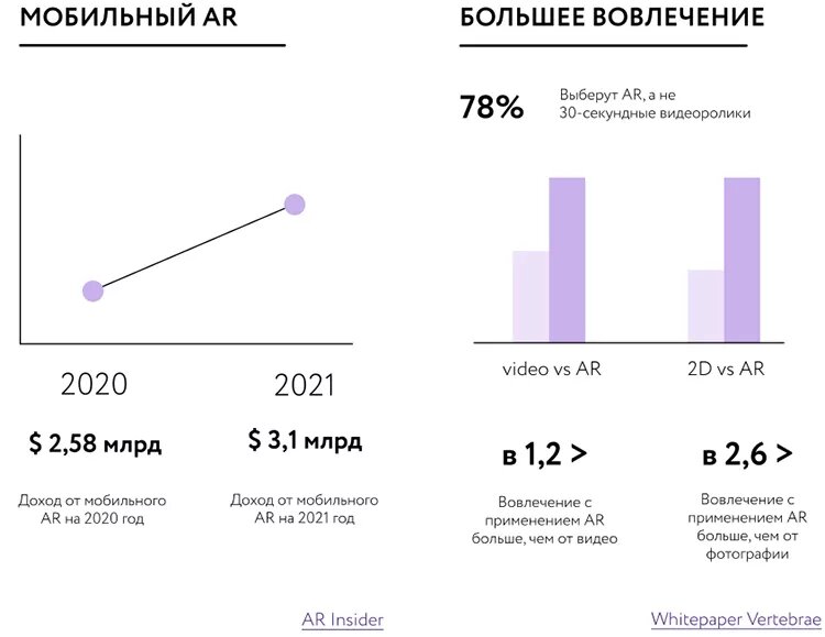 - середній час перегляду і взаємодії з контентом 2 хвилини 43 секунди, що говорить про високу ефективність AR, як інструменту презентації та показу товарів;