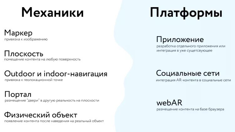 Більшість кейсів застосування доповненої реальності відрізняються один від одного механікою і обраною платформою. Механіка – це спосіб показу контенту, а платформа – це те, на базі чого буде розташований контент: