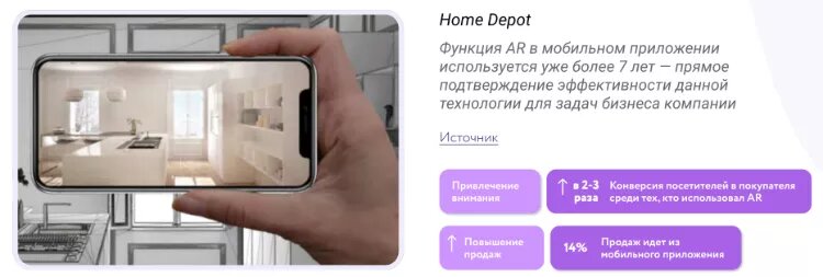 У мобільному додатку від Home Depot вже сім років впроваджується функція доповненої реальності для перегляду меблів. Завдяки механіці розміщення об’єкту на площину, покупці можуть подивитися товар перед покупкою у себе вдома і придбати вподобані меблі з програми.