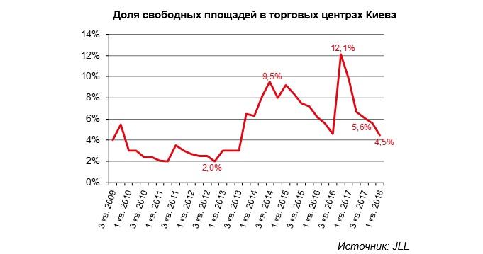Відповідно до нового звіту консалтингової компанії JLL, за I квартал 2018 року частка вільних площ на ринку якісних торгових центрів Києва скоротилася до 4,5%, що є найменшим показником з кінця 2013 року. При цьому, показник вакантності безперервно знижується протягом п’яти кварталів, і його динаміка не змінилася навіть з урахуванням введення 34 000 кв. м на початку цього року.