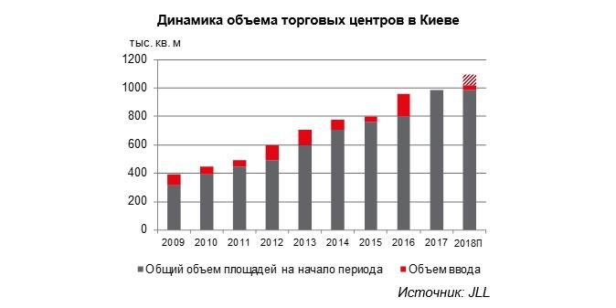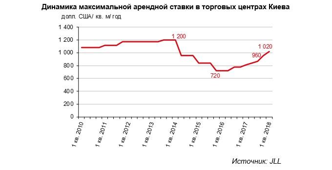 JLL зазначає, що в якісних торгових центрах Києва в I кварталі 2018 року максимальні орендні ставки збільшилися на 6% і перевищили $1000 за кв. м в рік ($85 за кв. м на місяць). Таким чином, показник наблизився до докризового рівня 2010-2013 років, коли ставки досягали $1100-1200 за кв. м в рік. ($90-100 за кв. м на місяць).