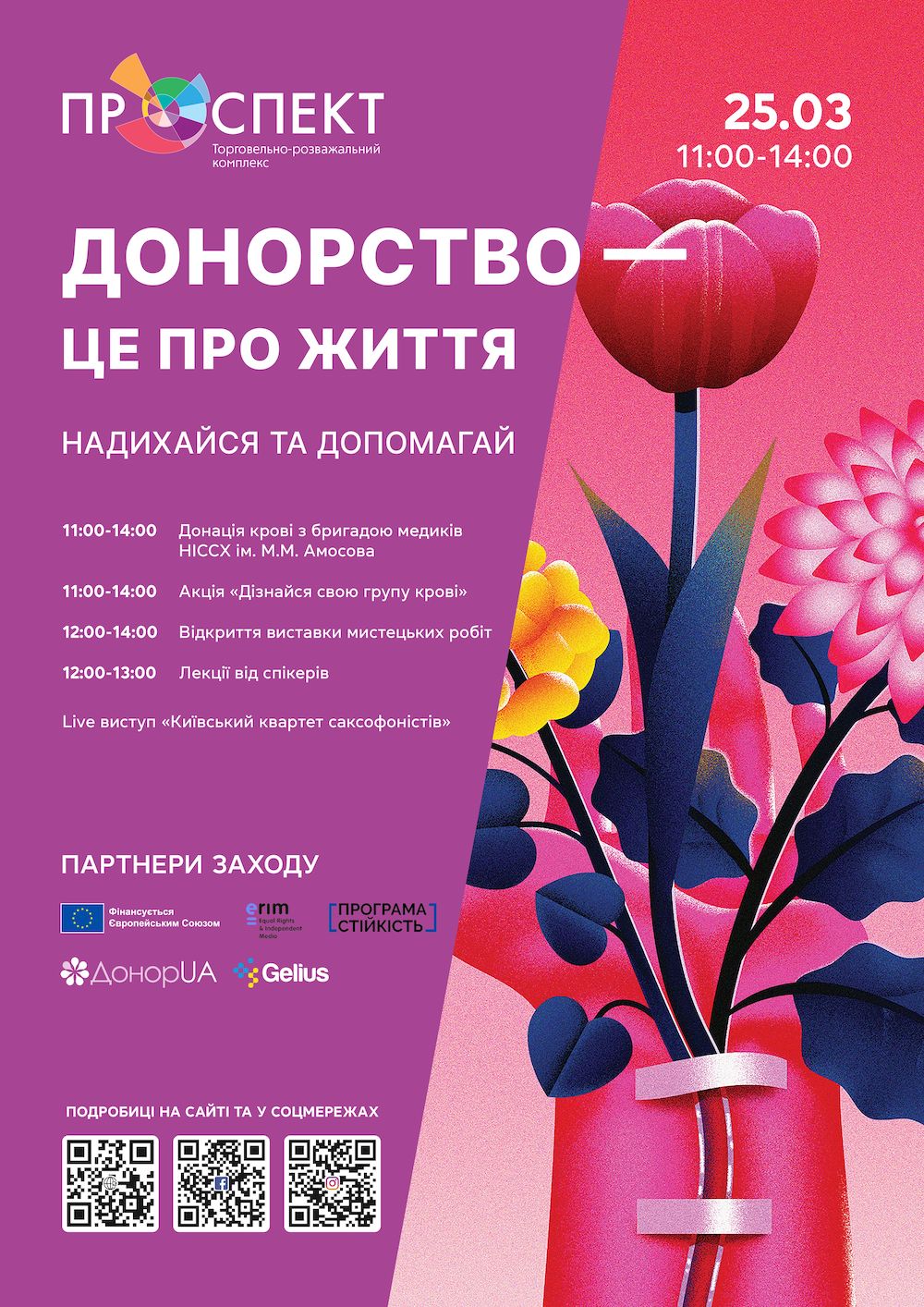 З 25 березня по 2 квітня ТРК Проспект організовує виставку сучасного мистецтва “Донорство – це про життя”, аби сформувати нове сприйняття донації, без якого неможлива побудова високої культури донорства.