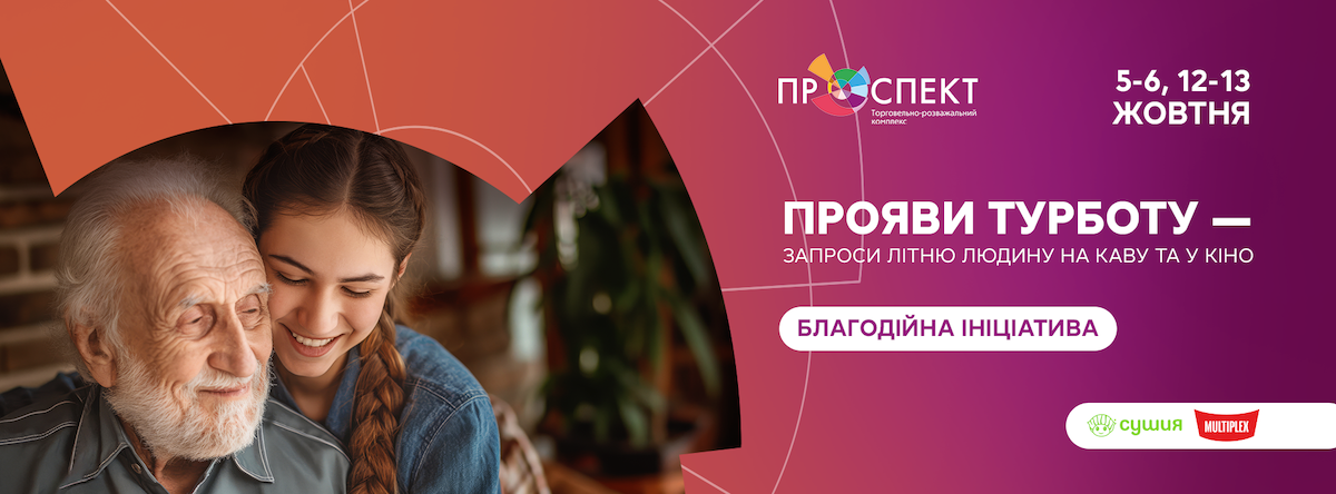 У перші вихідні жовтня ТРК Проспект спільно з партнерами — рестораном Сушия та мережею кінотеатрів Multiplex — запрошували жителів Києва провести вихідні у компанії важливих для вас літніх людей: матері, дідуся чи бабусі, сусіда чи колеги, які так потребують нашої уваги. За умови пред’явлення пенсійного посвідчення, кожен учасник акції мав змогу пригоститися* чізкейком та випити каву або чай в ресторані Сушия, що в ТРК Проспект, а також отримати безкоштовний квиток на будь-який* фільм у кінотеатрі Multiplex.