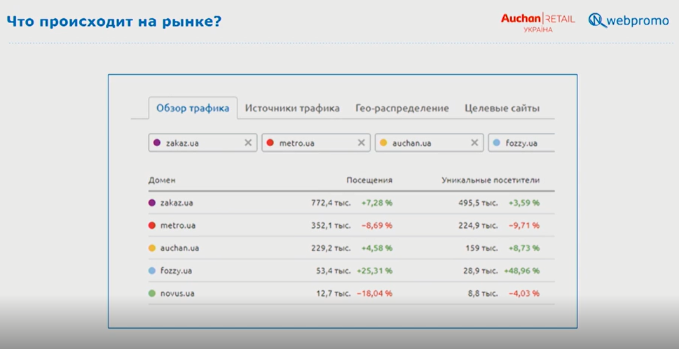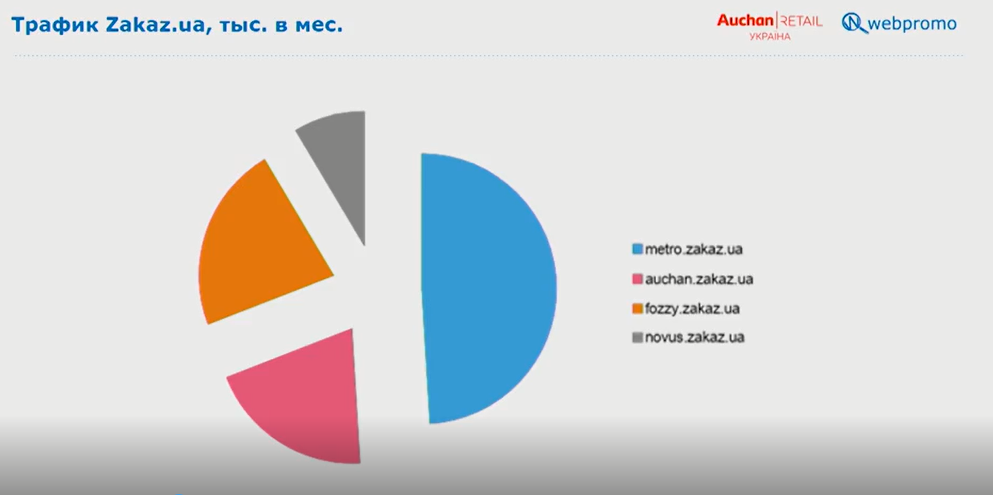 При цьому в структурі трафіку самого Zakaz.ua найбільша частка у Metro. Далі йдуть Ашан, Fozzy і Novus.