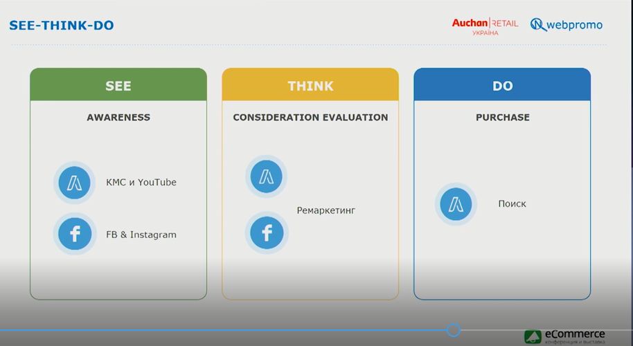 Наступний етап – Do. Він починається, коли у людини є потреба. Компанія обробляє великий обсяг пошукового попиту, оскільки обсяг продукції в Ашан величезний. І ми починаємо відповідати на сформований попит, який присутній вже в пошукових системах.
