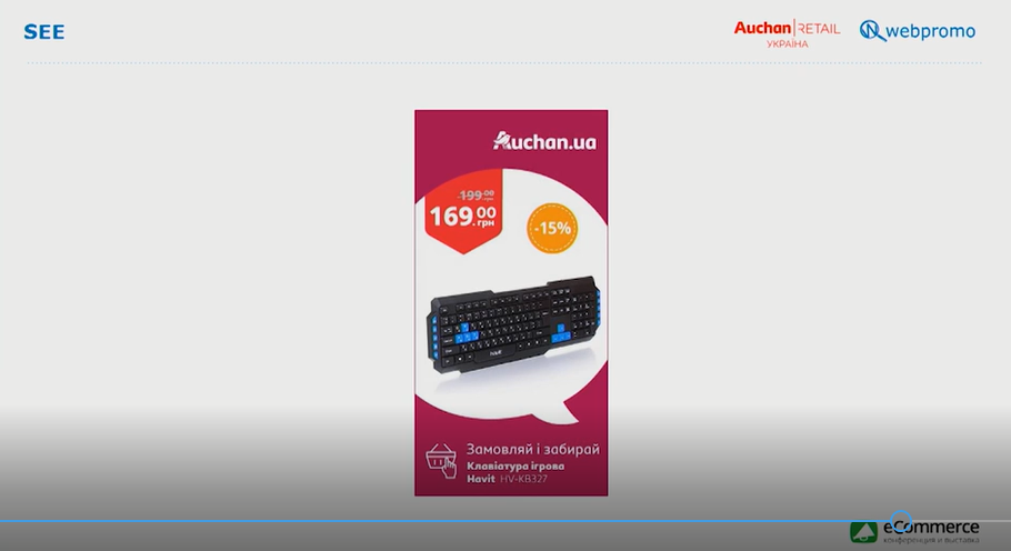Всі використовують такі канали як реклама в стрічці Facebook, в правій колонці Facebook, стрічка Instagram і т.д. З тих каналів, які показали особливу ефективність саме у Ашан – це реклама в сторіз. Дивно, що рекламу там запускають зовсім небагато компаній.