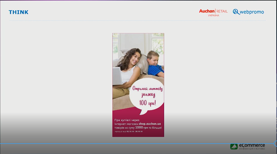 Think – це етап, коли людина вже потрапив в широку воронку продажів, у нього є розуміння послуги, товари Ашан йому підходять. Тепер потрібно повторно з ним прокомунікувати, привести в офлайн, переконати його забрати товар з поштомата, або скористатися іншим рішенням. Тут можна використовувати купони, можливість отримати 100 грн знижки при покупці на певну суму. Це одне з найбільш ефективних маркетингових повідомлень: у людини сформована потреба, вона отримує купон і активує його, здійснюючи покупку.