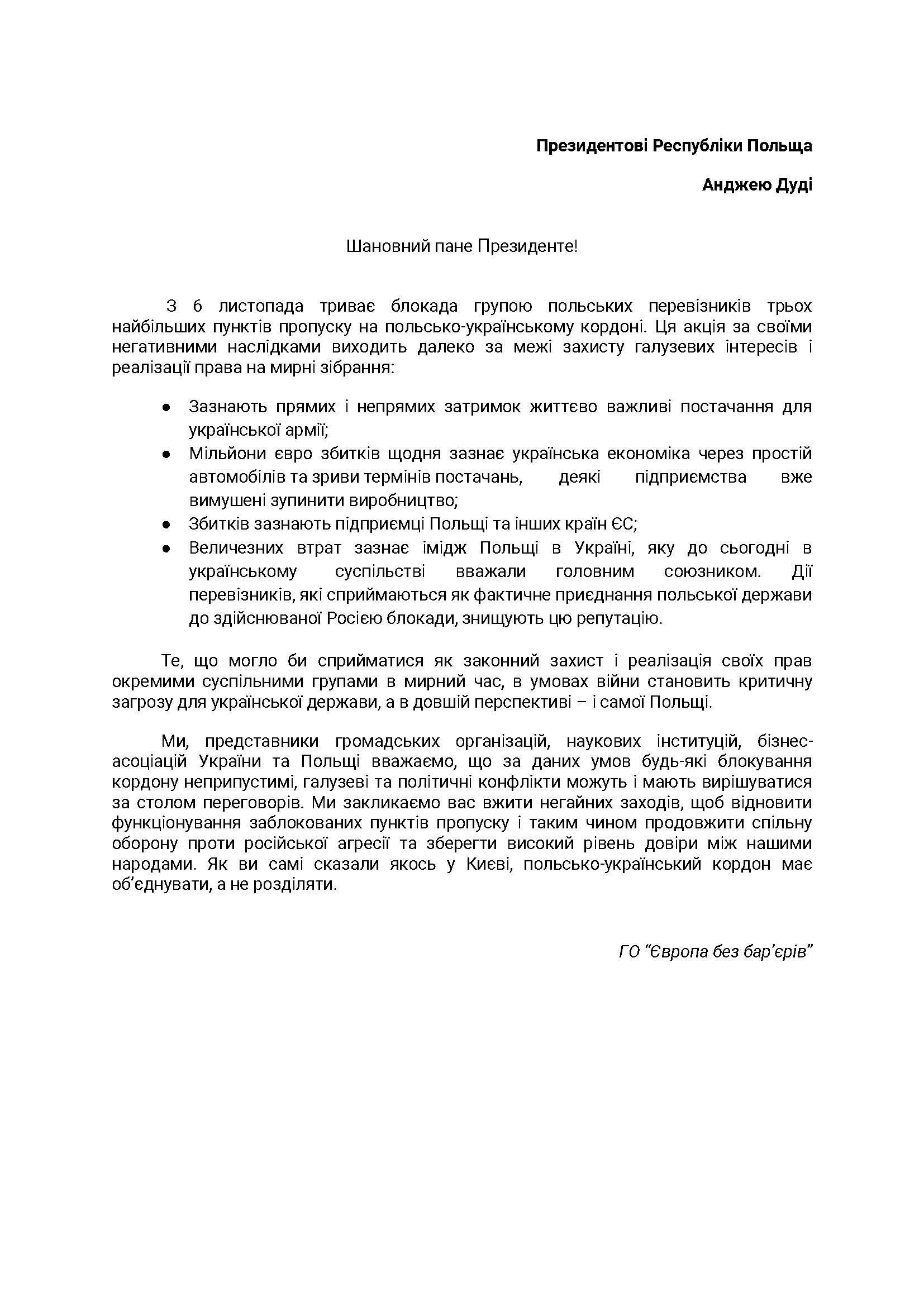 Українська бізнес-спільнота впевнена, що мирне вирішення конфлікту та відновлення роботи заблокованих пунктів пропуску – єдиний правильний крок для підтримки національних інтересів та об’єднання України та Польщі для спільної оборони проти російської агресії. У зв’язку з цим було підготовлено відкритий лист до Президента Польщі із закликом вжити негайних заходів по відновленню функціонування заблокованих пунктів пропуску та розпочато збір підписів на його підтримку серед громадських організацій, наукових інституцій, бізнес-асоціацій України та Польщі. До підпису відкритого листа долучилась і Асоціація рітейлерів України.