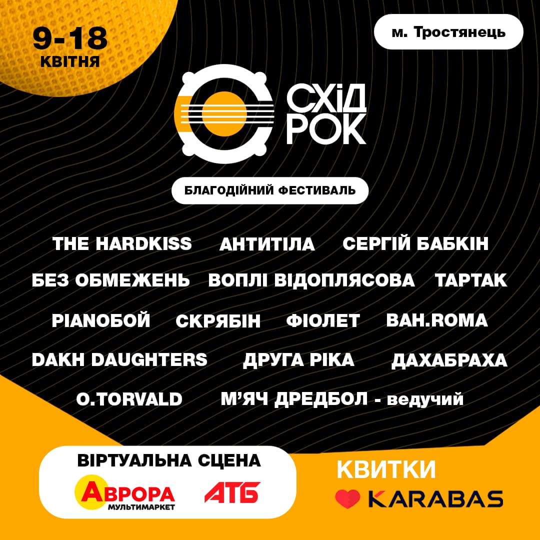 Благодійний віртуальний фестиваль СХІД-РОК підтримав легендарний ведучий М’ЯЧ ДРЕДБОЛ та чимало відомих українських виконавців: THE HARDKISS, АНТИТІЛА, СЕРГІЙ БАБКІН, БЕЗ ОБМЕЖЕНЬ, ВОПЛІ ВІДОПЛЯСОВА, ТАРТАК, PIANOБОЙ, СКРЯБІН, ФІОЛЕТ, BAH.ROMA, ДРУГА РІКА, DAKH DAUGHTERS, ДАХАБРАХА.