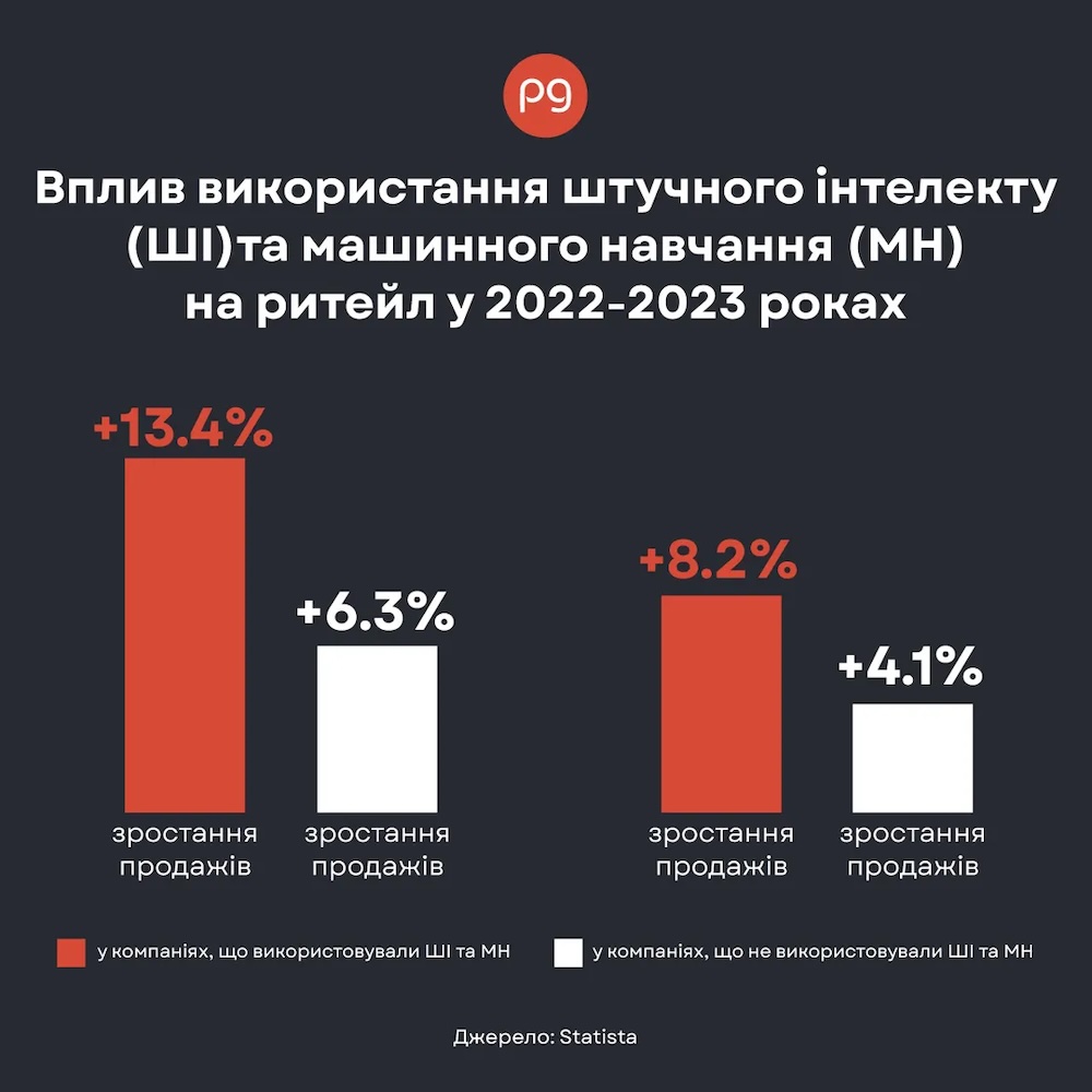 За даними Statista, світові ритейл-компанії, що використовують сучасні технологічні рішення, зростають швидше, ніж інші. Ресурс публікує дані опитування керівників ритейл-компаній, згідно з яким кожна п’ята компанія використовує штучний інтелект або машинне навчання для автоматизації щоденних завдань.