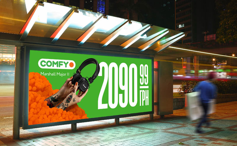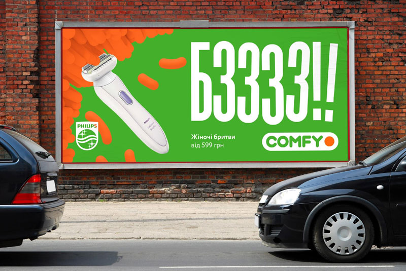 А ще шрифт. Тепер у Comfy з’явився власний шрифт, щоб всі смартфони, кавоварки, електрощітки, пилососи, холодильники і навіть манюсінькі флешки розмовляли особливою комфі-мовою. Головною вимогою до нього були помітність і вдала взаємодія з Пушем. Він вийшов простим, без відволікаючих елементів, не важкий, проте достатньо вагомий, щоб бути помітним навіть на найбожевільніших пушевих композиціях.