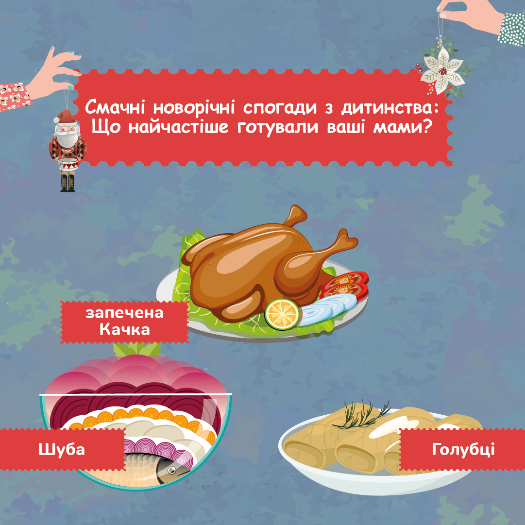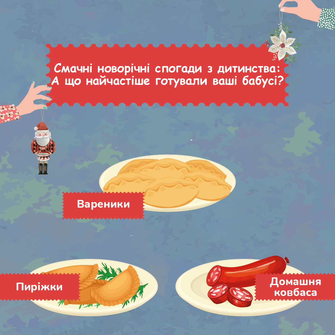 Для порівняння: під час опитування учасників, Varus вияснив, які новорічні страви з дитинства закарбувалися у спогадах дорослих українців. На застіллі, яке готувала мама, в більшості учасників конкурсу були традиційні олів’є й холодець, а от найпопулярнішою прикрасою того часу був не торт, а запечена качка. В топі також салат шуба та голубці. Бабуся ж пригощала варениками, пиріжками, голубцями й, звісно, олів’є та холодцем.