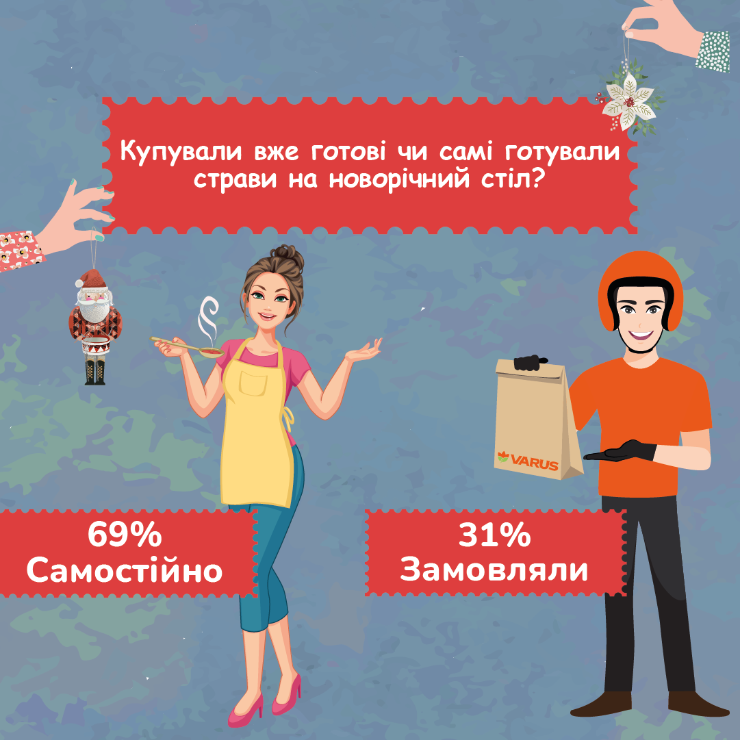 Більшість українців цього року готували смаколики на свята самостійно. Так, за даними конкурсу у 31% українців стіл прикрашали готові страви із супермаркетів. Натомість, 69% респондентів вирішили накрити новорічний стіл власноруч.