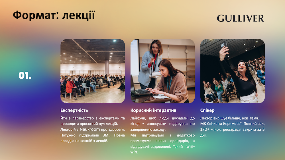 - Експертність. У лютому минулого року ми запустили спільний проект з NaukRoom – це успішна освітня платформа в Україні. Разом з ними ми зробили лекторій про здоров’я, який бив усі рекорди по відвідуваності. На ці лекції приходило понад 150 слухачів. Це дало нам підтвердження того, що лекції можуть бути успішними.