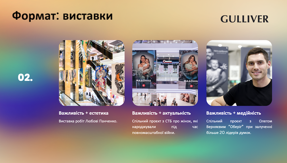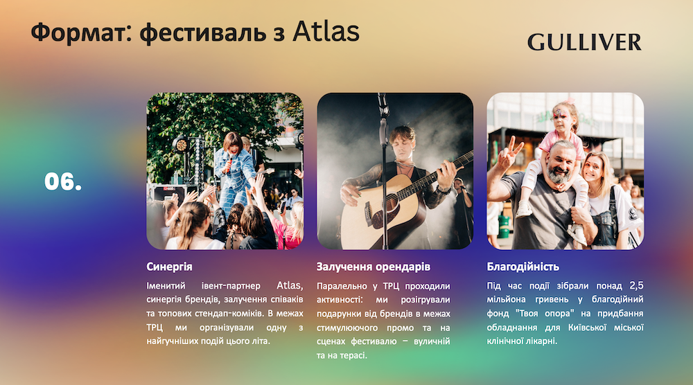 Головною подією цього літа для нас став музичний фестиваль Атлас, який проходив на території БФК Gulliver. Ця подія містила усі важливі компоненти, які я вище перерахувала. В нас були потужні партнери, ми добре подбали про безпеку. Так, на випадок повітряної тривоги ми зробили в укритті додаткову сцену з музичним обладнанням, щоб безпечно продовжити концерт. Фестиваль мав і благодійний компонент: під час його проведення нам вдалося зібрати 2 млн грн, які ми передали фонду Твоя опора на придбання медичного обладнання для Київської міської лікарні.