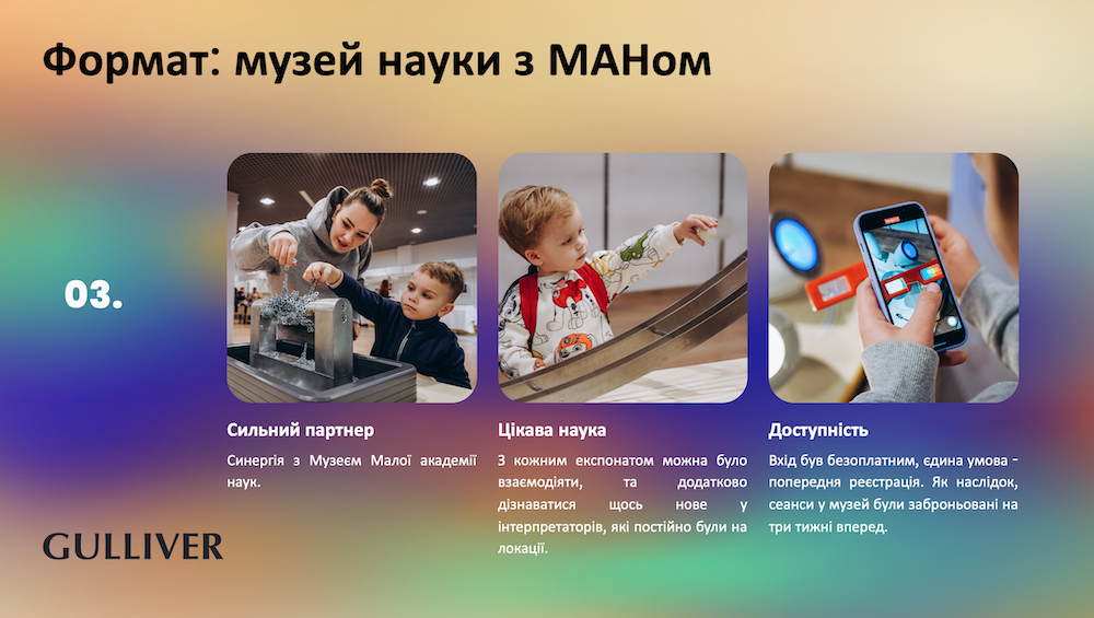 Одним із найпопулярніших наших проектів є Музей Науки, який ми реалізували у партнерстві з Малою академією наук України. Секрет успіху цього проекту у дуже сильному партнерові. Мала академія наук є лідером популярної науки в Україні, оскільки реалізувала багато важливих досліджень, які, до того ж цікаві аудиторії.