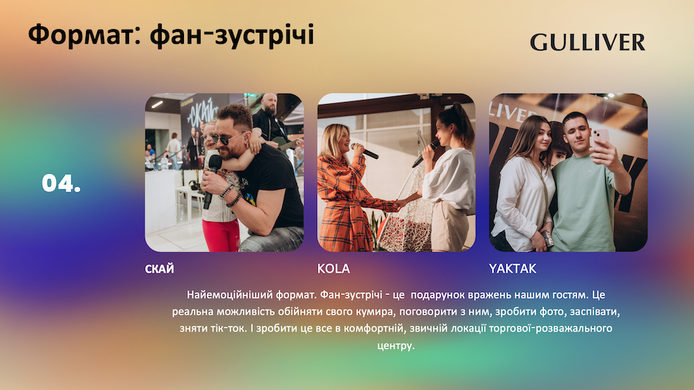 Ще один успішний формат наших заходів – це фан-зустрічі. Ми дуже уважно аналізували поведінку та настрої відвідувачів, щоб зрозуміти, чи на часі такий розважальні заходи. У травні ми наважились на проведення першої фан-зустрічі з гуртом Скай. І отримали підтвердження, що наша аудиторія потребує таких теплих та емоційних зустрічей, де фани можуть поспілкуватися зі своїм кумиром, зробити з ним фото, обійняти його, а також заспівати разом з ним улюблені пісні. На концерті це зробити неможливо, а в комфортній обстановці торгового центру – це доступно.