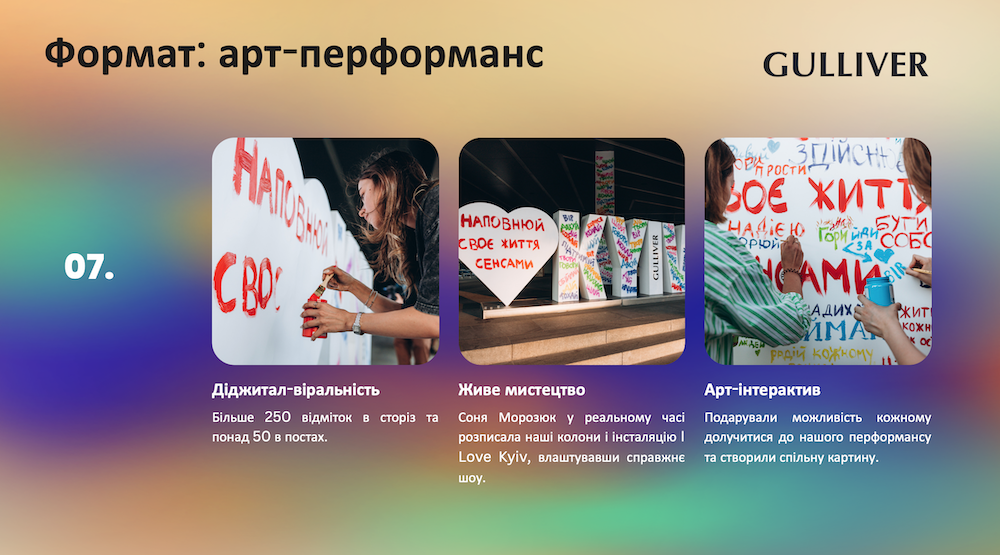 Також нещодавно ми провели арт-перфоманс з художницею Сонею Морозюк. На перший погляд, у винятково інстаграмну історію ми вклали великий сенс. Кожен відвідувач, який зараз заходить у Гулівер бачив надихаючі та мотичуючі слова “мрій”, “дій”, “кохай”, “досягай”.