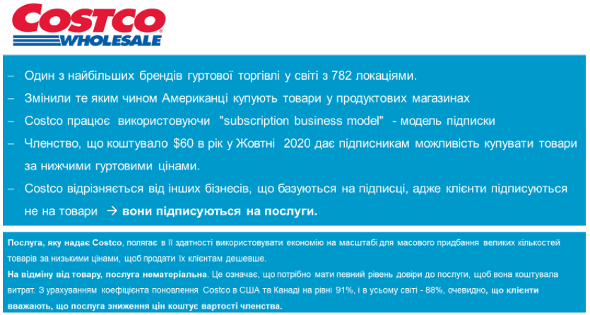 Відомий американський рітейл-оператор Costco впровадив модель підписки на членство у приватному клубі, де за $60-120 на рік члени клубу отримують унікальні пропозиції та знижки на товари. У 2019 році ця послуга принесла Costco близько $3 млрд додаткового доходу.
