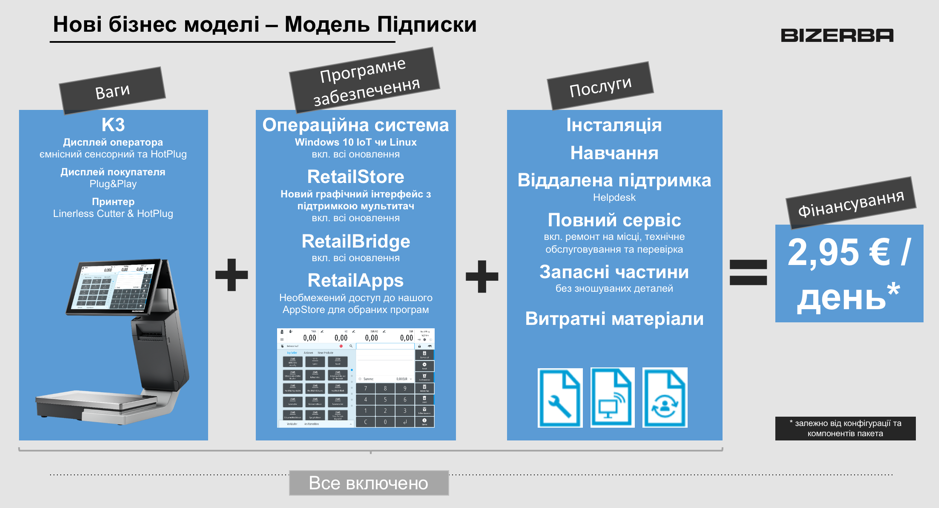 Наступного року така модель буде активно розвиватись і в Україні. Наприклад, Біцерба Україна у 2021 році планує запровадити послугу підписки на розумні ваги. Всього за 2,95 євро в день роздрібний оператор отримає цілий пакет послуг – можливість користуватись обладнанням і спеціальним програмним забезпеченням, а також повне сервісне обслуговування.