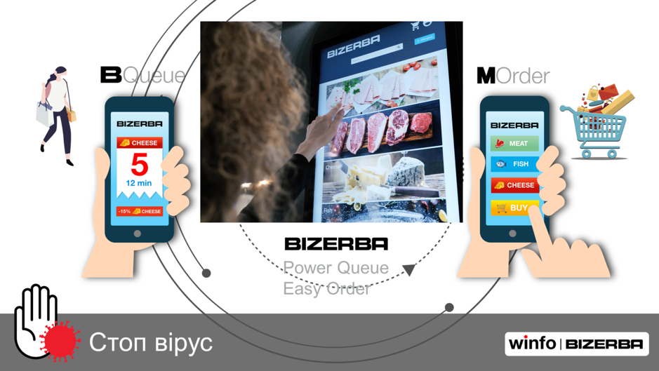 Нове рішення, яке ми пропонуємо, дозволяє покупцю увійшовши до магазину за допомогою спеціального додатку у смартфоні вибрати відділ, в який він хоче потрапити, наприклад, відділ «Сир» . Далі система повідомить покупцеві номер у черзі та коли потрібно підійти до відділу. Також в цьому додатку можна вказати скільки та якої продукції потрібно та чи необхідно її нарізати. Як тільки замовлення готове – покупець отримує про це повідомлення.