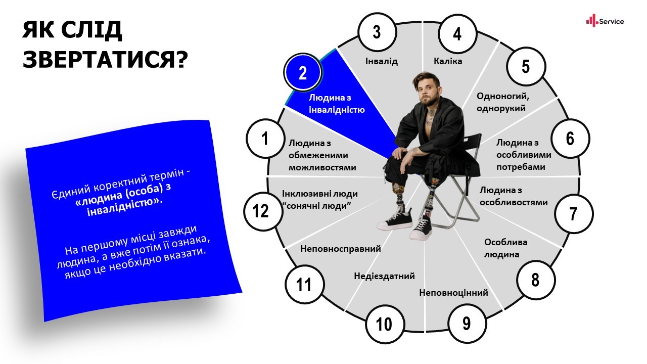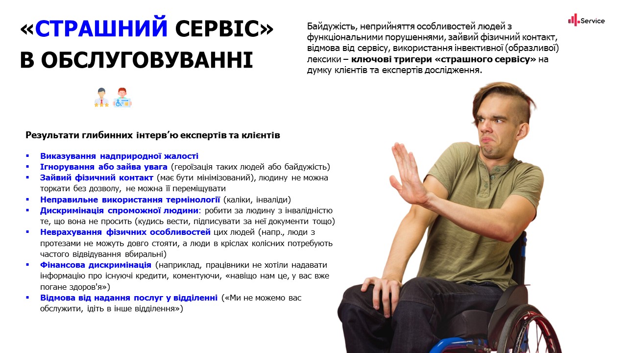 Респонденти, які взяли участь у дослідженні, сформували ключові тригери “страшного сервісу” — факторів, які мають бути змінені у підходах до обслуговування клієнтів з інвалідністю. Серед них виказування надприродної жалості, ігнорування, або, навпаки, надмірна увага. Стовідсотковим табу має стати зайвий фізичний контакт — людину не можна торкати без дозволу, а тим паче її переміщувати. Те ж саме стосується й спроб зробити за людину те, чого вона не просить — кудись відвести, підписати за неї документи тощо, бо це є прояв дискримінації спроможності. При цьому треба враховувати фізичні особливості таких клієнтів — у тому числі розуміти, що у людини можуть бути також комунікаційні бар’єри через те, що вона нечасто спілкується з іншими людьми.