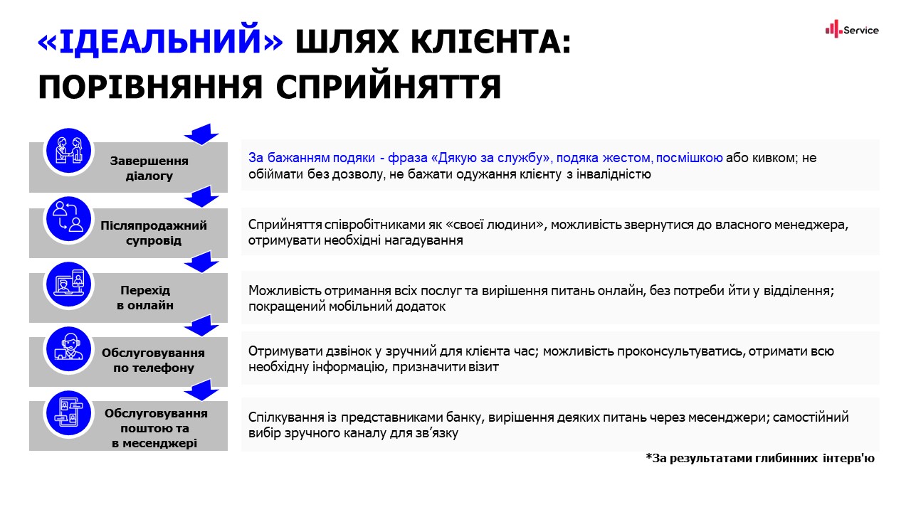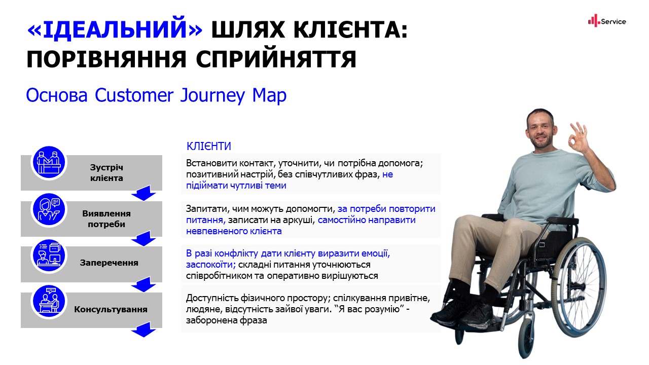 Говорячи про обслуговування, опитані наголошували на тому, що сервіс має бути передусім доступним та людяним. На основі результатів та висновків опитування аналітики холдингу 4Service сформулювали основу для мапи клієнтського досвіду з “ідеальним” шляхом споживача з інвалідністю. Він складається з наступних етапів: зустріч клієнта, виявлення потреби, консультування, завершення діалогу, післяпродажний супровід, перехід в онлайн. Головна ідея у тому, що комунікація на кожному з цих етапів має бути максимально позитивною, зрозумілою та безбар’єрною — зокрема, мова про те, щоб якомога більше послуг ставали доступними в режимі онлайн, без необхідності фізично приходити в локацію.